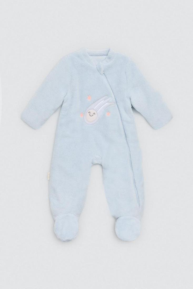 Buzo de bebé de manga larga para mantener calentito a tu pequeño. Posee un cierre de cremallera para mayor comodidad. En azul celeste con detalle en la parte delantera.