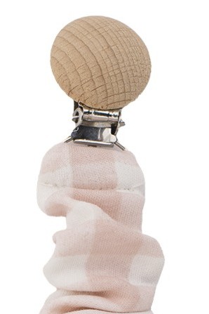 Chupetero de tela a cuadros vichy con enganche de madera. Perfecto para que tu bebé lleve el chupete sin molestias. De la marca Calamaro