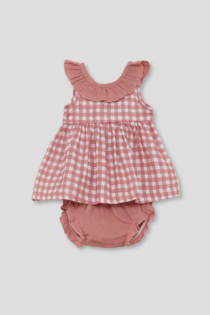 Conjunto de dos piezas para recién nacido niña. Jesusito sin mangas en estampado vichy color maquillaje con cuello volante a juego. La parte trasera luce un bonito escote adornado con un gran lazo, que aporta un toque dulce y elegante al diseño. Braguita lisa en color maquillaje, con cintura y bajos elásticos que garantizan un ajuste cómodo. Confeccionado en tejido ligero y transpirable, perfecto para los días cálidos, aportando frescura y comodidad a la pequeña.