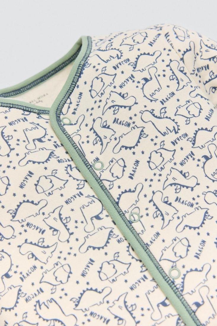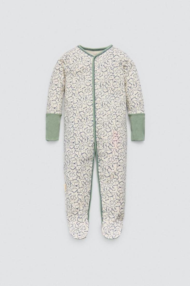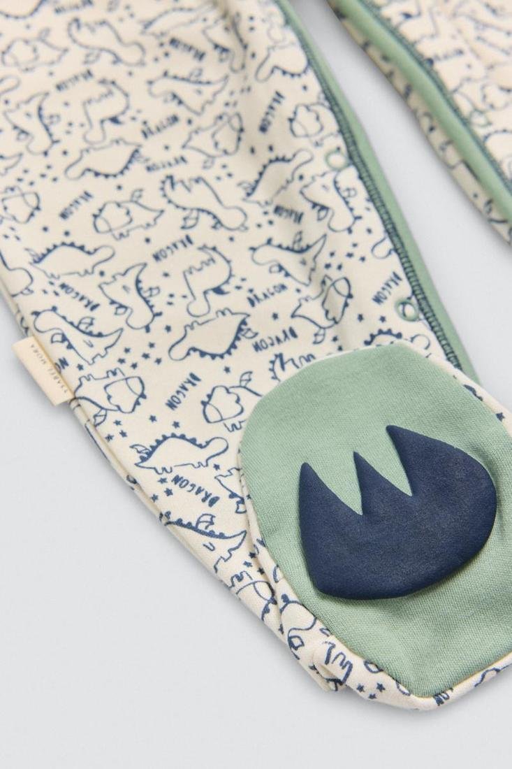 Pelele de algodón natural para bebé de manga larga con interior afelpado y con cierre de cremallera. Este modelo cuenta con un estampado de dinosaurios y antideslizante en los pies para que tu pequeño se sienta más cómodo y seguro.