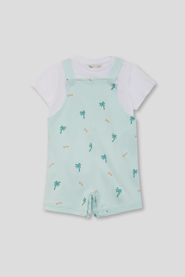 Conjunto de dos piezas, camiseta y peto para niño. Camiseta blanca de manga corta con cuello redondo. Peto en color verde agua con estampado de palmeras y texto, tirantes abotonados y cierre con botones a presión en la parte inferior.